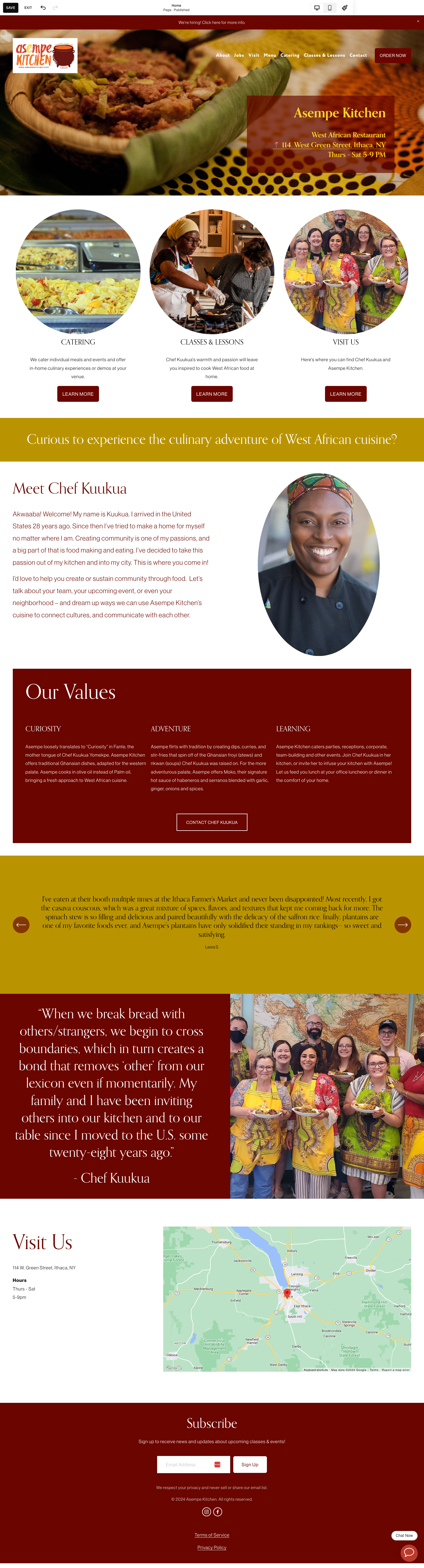 Asempe Kitchen is a West African restaurant in Ithaca, New York. It’s one of a kind in the area, with bold branding and a vibrant story. But their website didn’t reflect any of that. The site felt generic and disconnected from the energy and personality of the business. None of their strong visual branding came through, and they didn’t have the tools they needed to sell online or promote their events.
