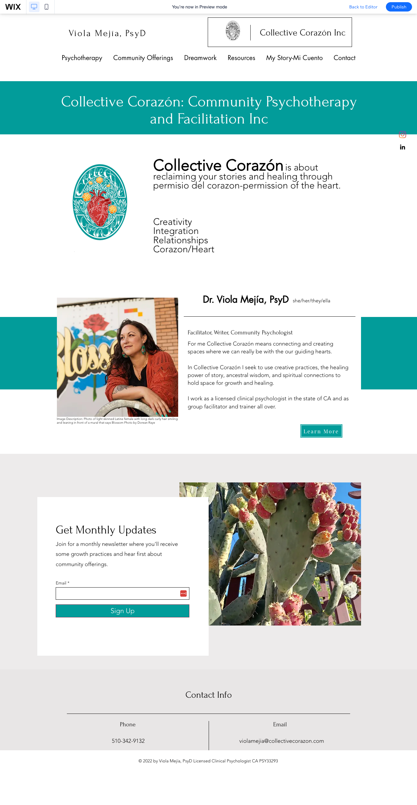 Viola Mejia is a psychotherapist based in Oakland who came to me with a website that felt completely disconnected from her work. The visuals were generic, the copy didn’t reflect her voice or values, and nothing about the site communicated the depth or uniqueness of what she offers. She wanted a site that not only looked better, but actually felt like her.