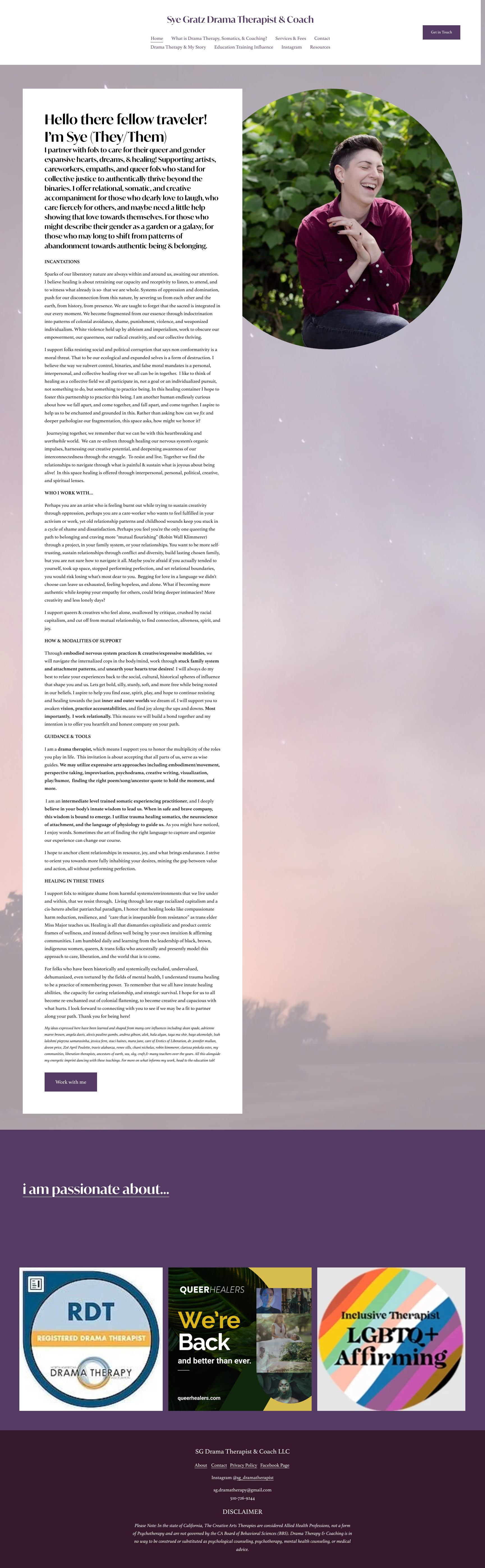 Sye Gratz is a drama therapist and somatic coach doing powerful, nontraditional work. But their website wasn’t quite showing that. The homepage was text-heavy, which made it hard for visitors to quickly understand what Sye offered or how the work could help them. Their unique approach as a drama therapist outside the medical model was mentioned, but not clearly highlighted. Navigation was confusing, and the site didn’t include any SEO to help the right people find it.